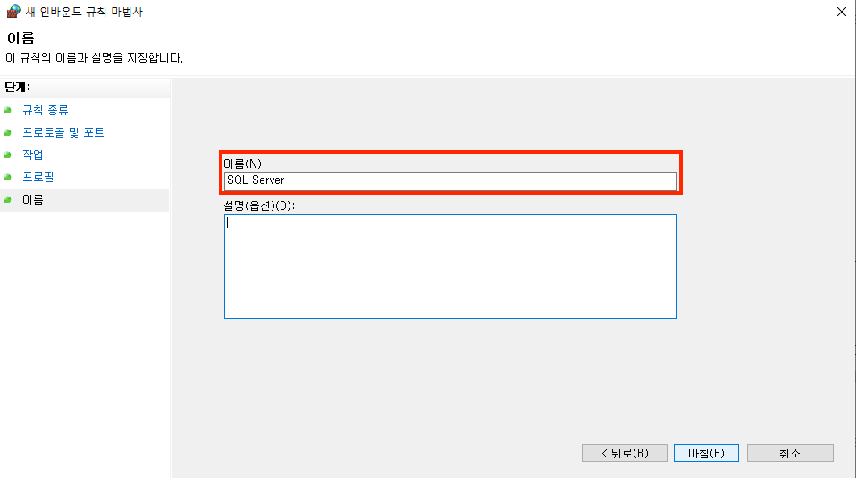 ※ 여담으로 SQL Server를 설치한다는건 그렇지 않은 경우(혼자 SQL 공부하는 용도 외)도 있겠지만 대다수가 웹 어플리케이션에서 연결하기 위해 설치할텐데 SQL Server 설치가 끝나면 1433 방화벽 오픈 하겠습니까? 뭐 이런 방식의 설정 변경이 자연스러운 흐름속에서 이루어지게 UX가 설계된다면 좋지 않았을까 하는 아쉬움이 있다.