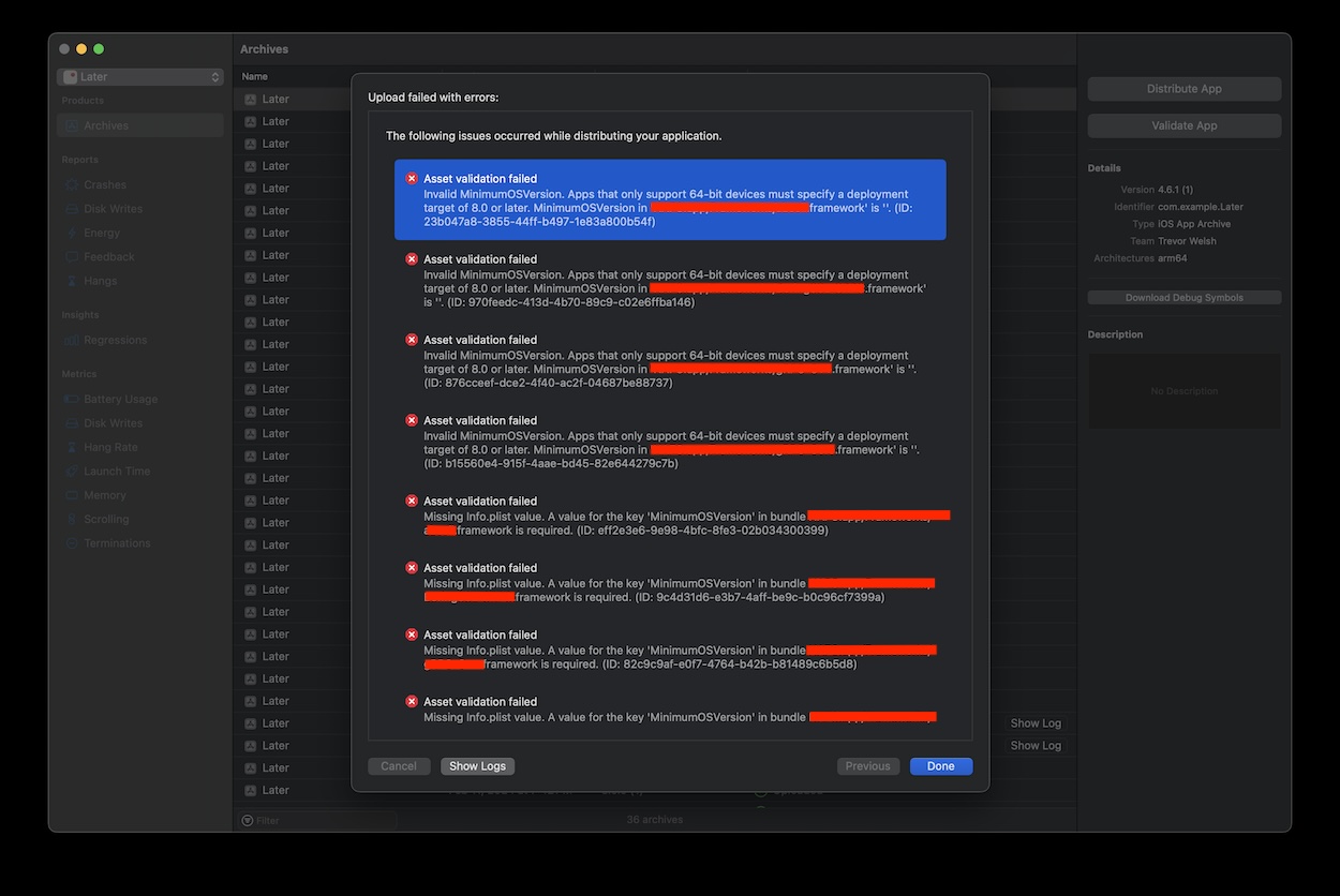 오류 원인은 프로젝트에서 사용중인 Firebase 모듈이 가지고 있는데 plist에 MinimumOSVersion 정보가 누락되어 발생하는 것으로 추정된다. 아마도 기존에는 3rdParty 모듈 내부의 MinimumOSVersion 까지 체크하지는 않았으나 최근에 체크하도록 변경이 있었나보다.