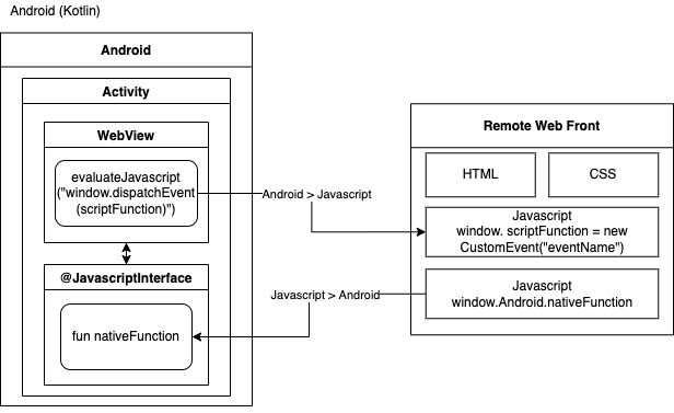 iOS WKWebView에서 Local/Remote 환경에 있는 Javascript와 인터페이스 하는 방식에 대해 간략히 살펴보겠습니다. 유사한 내용을 정리한 글은 찾아보면 많이 있지만 대부분 한 쪽 측면(웹 또는 네이티브)으로 작성되어 있다보니 웹 프론트 사이드에서 해야 할 일, 네이티브 사이드에서 해야 할 일을 분명하게 명시해서 어떤 지점에서 인터페이스 규약을 서로 맞춰야 하는지에 대한 관점을 우선으로 정리해봤습니다. iOS > Javascript iOS에서 Javascript 소스를 호출하는 방법은 3가지 방식이 있습니다. 웹프론트가 어떤 방식으로 개발됐는지에 따라 적용 가능한 방법이 다를 수 있으니 유의해주세요. 방법1 React.js, Vue.js와 같이 컴포넌트 기반의 SPA 방식으로 개발..